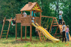 Детям постарше безусловно понравится яркая двухволновая горка со скатом 2.7 метра. А для активных и подвижных в этой площадке предусмотрен устойчивый модуль с металлическим турником.