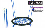 Качели-гнездо Midzumi выполнены из металлической рамы диаметром 80 сантиметров, с дополнительной защитной оплеткой ее бортиков, обтянутых прочным синтетическим канатом толщиной 10 мм выдерживающим нагрузку 100 кг. Плетеное синтетическое сидение качелей удобное и практичное, не собирает грязь и воду, при сильных загрязнениях его можно протереть.